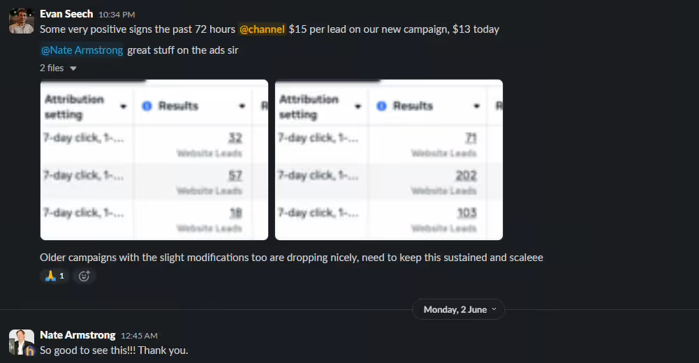 And to this day, he's still booking calls at roughly $100 per call because of our messaging, back end conversion systems, and repositioning of his offer. We are sitting at sustained 3.16x ROAS on CASH COLLECTED. Not contract value (he sells retainers).